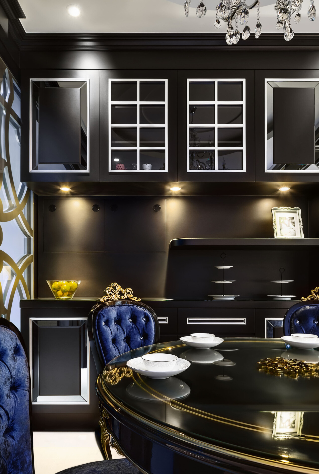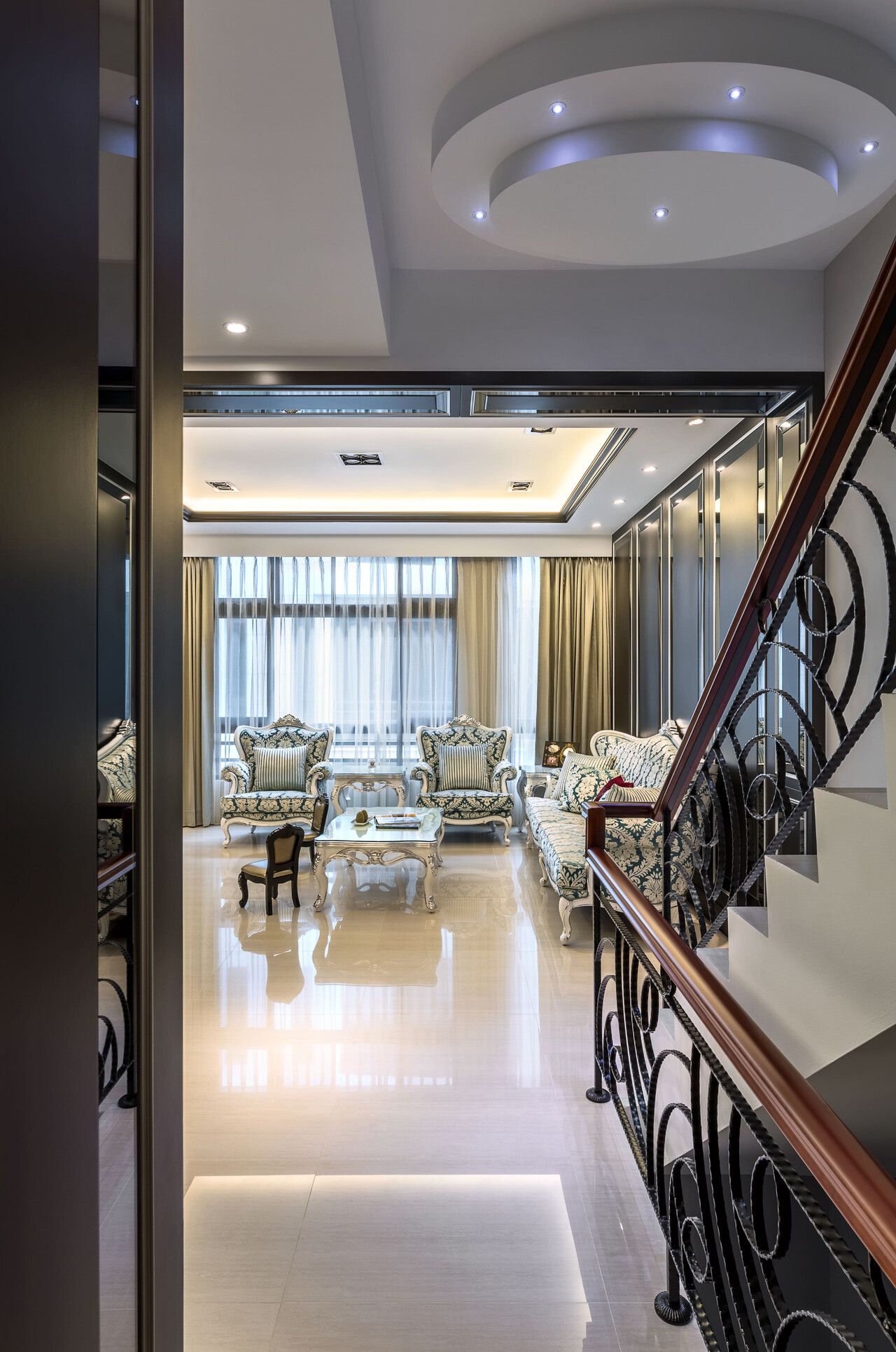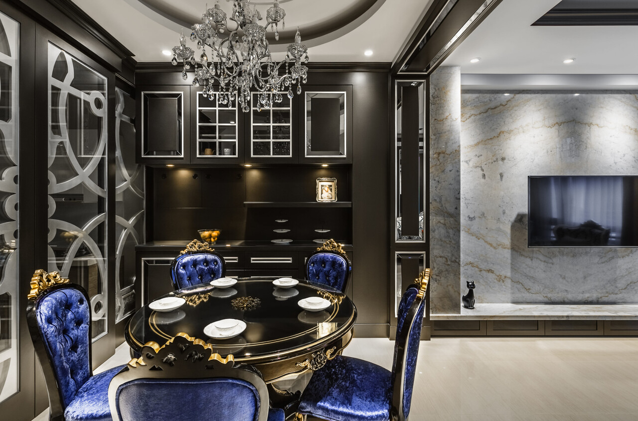 喜愛新古典和現代主義的屋主,對於設計有獨特想法,希望四層樓半的別墅,推翻過去常見的古典表徵,跳脫出風格制式框架。沐恩空間設計突發奇想,大膽以黑色和銀色做搭配,適度加入酒紅與寶藍帶來畫龍點睛效果,營造出國外夜店般的酷炫氛圍,打造出獨樹一幟又無法複製的個性宅。
