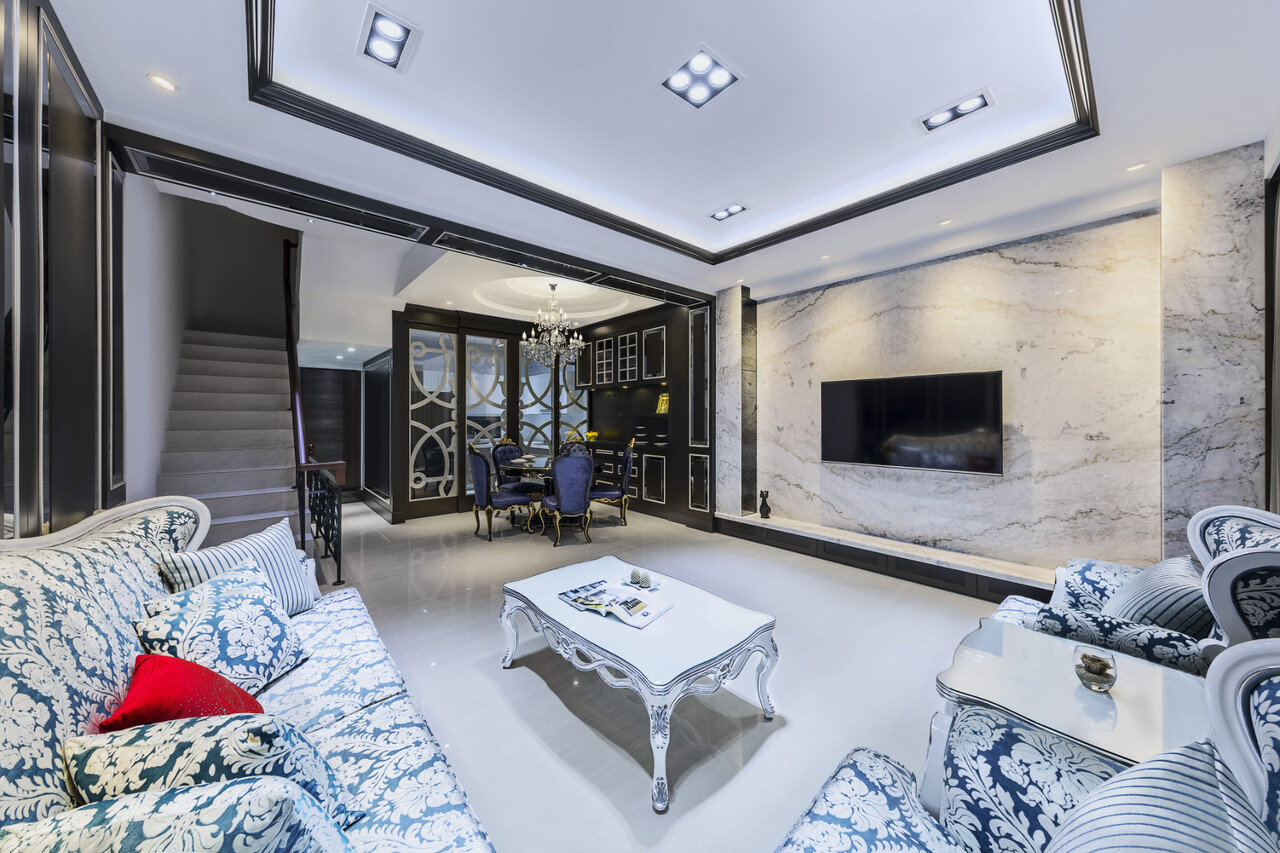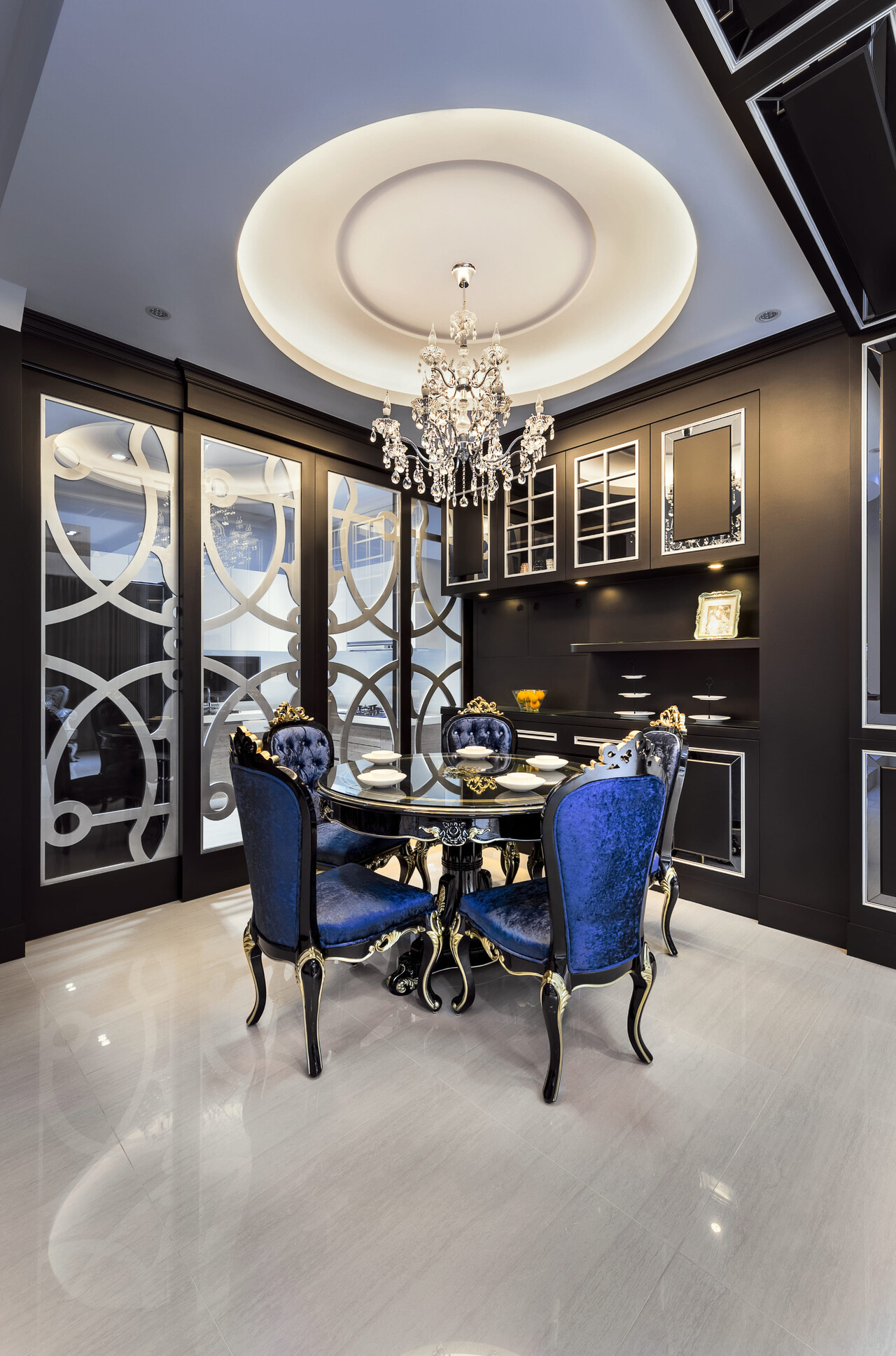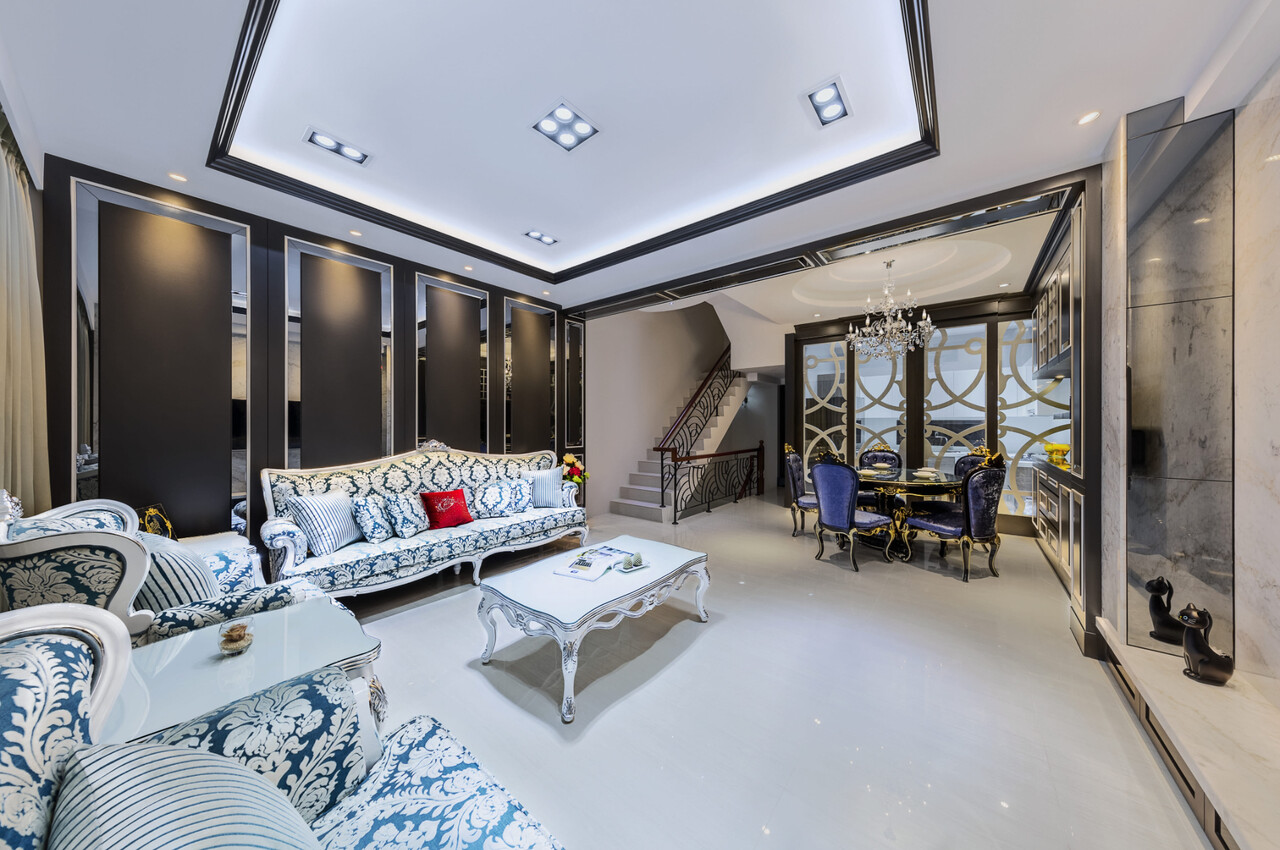 喜愛新古典和現代主義的屋主,對於設計有獨特想法,希望四層樓半的別墅,推翻過去常見的古典表徵,跳脫出風格制式框架。沐恩空間設計突發奇想,大膽以黑色和銀色做搭配,適度加入酒紅與寶藍帶來畫龍點睛效果,營造出國外夜店般的酷炫氛圍,打造出獨樹一幟又無法複製的個性宅。