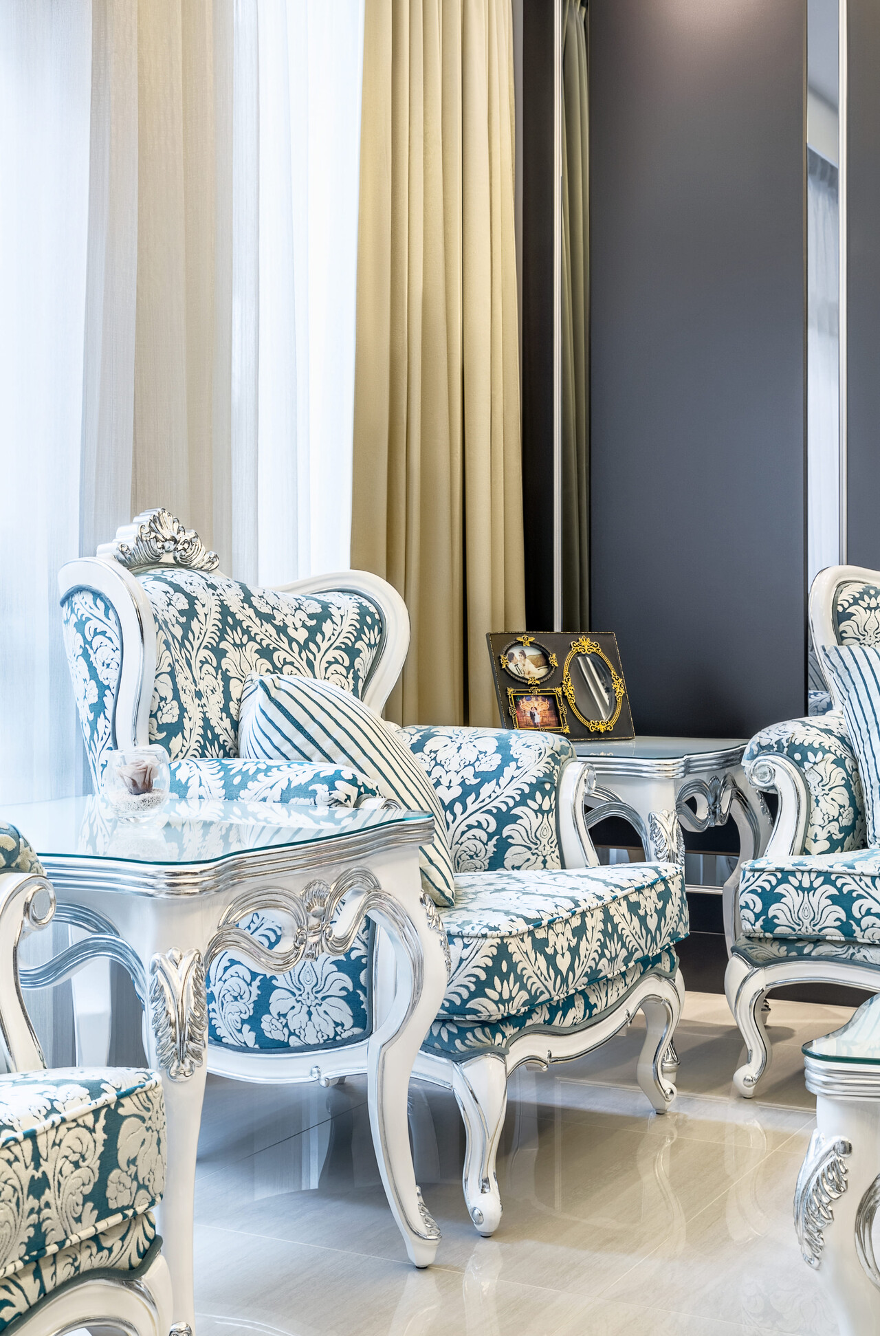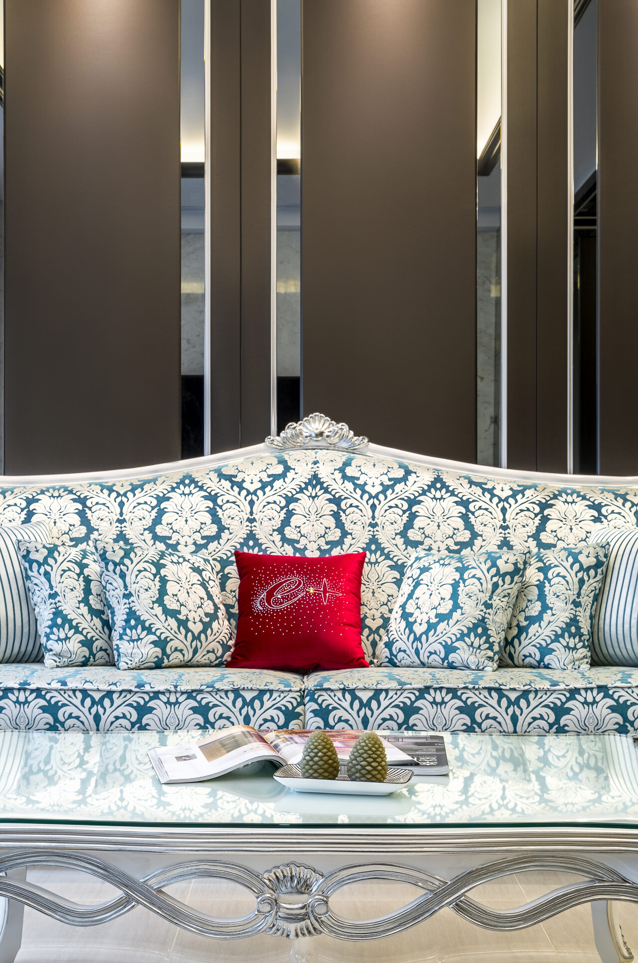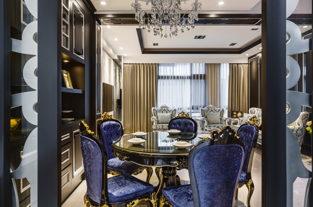 採相近色系的異材質搭配,以線板結合灰鏡質材,讓公領域交織出時尚個性的黑銀兩色。空間視覺循序漸進,運用法式巴洛克風家具,帶來跳色手法創造堆疊的視覺層次,增加色彩變化性。分別擺放不同色系家飾軟件,讓餐廳籠罩在寶藍色系,奢華設計引人入勝;書房大膽採用酒紅色,營造超跑風的時尚炫亮。私領域反其道而行,改使用粉嫩色系圍塑明亮舒適的氛圍,彰顯出衝突對比之美。