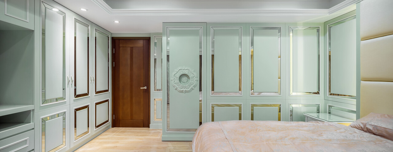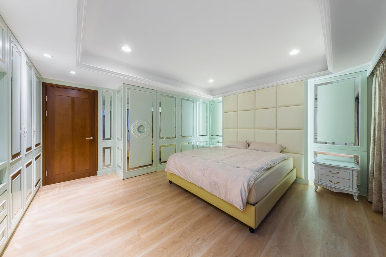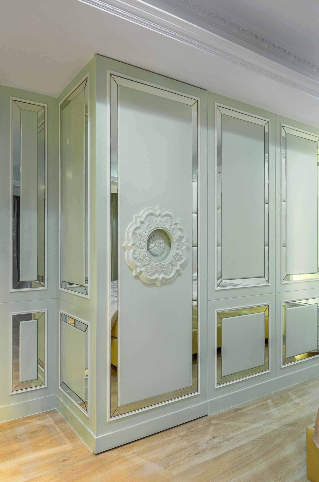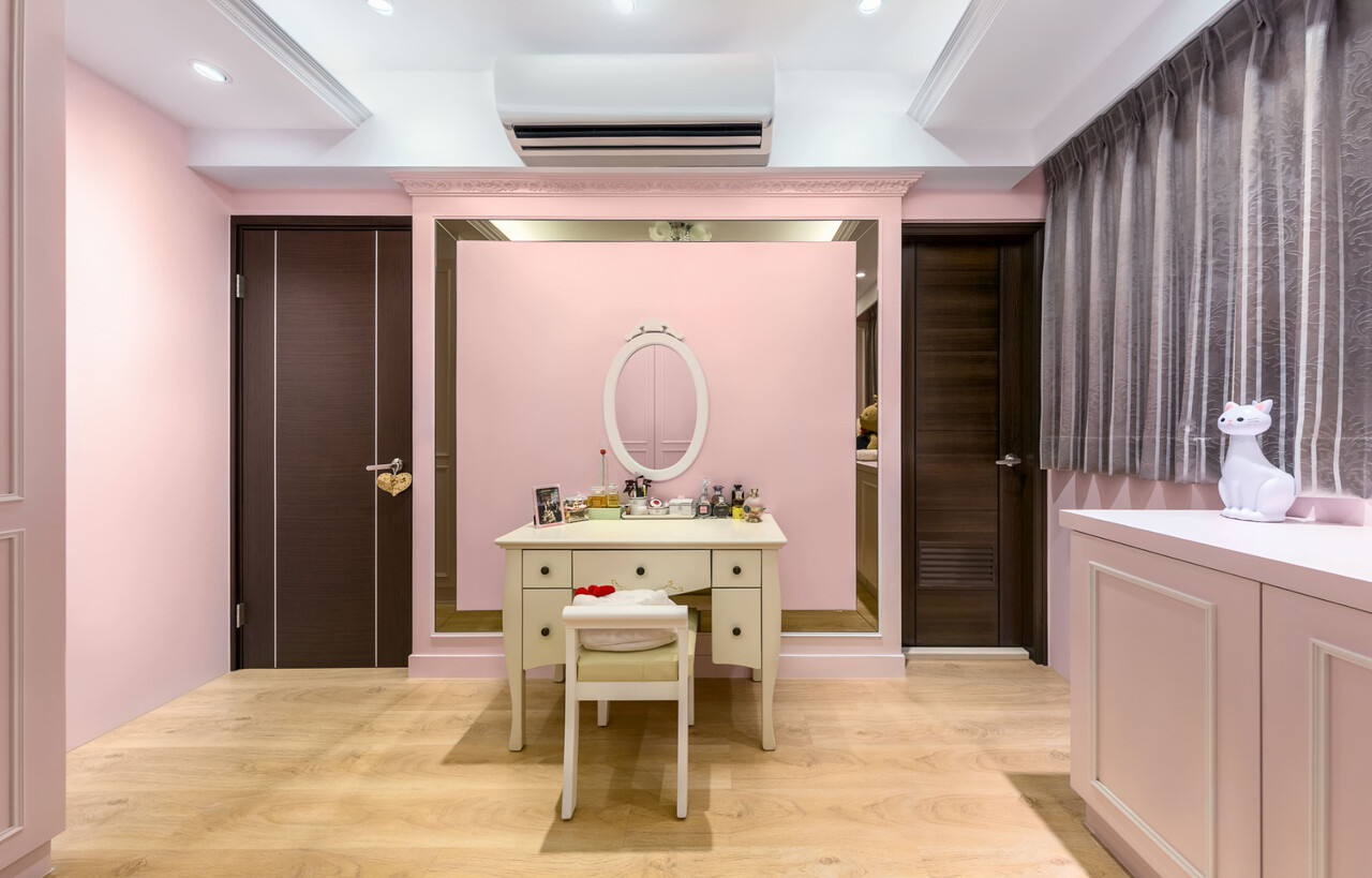 採相近色系的異材質搭配,以線板結合灰鏡質材,讓公領域交織出時尚個性的黑銀兩色。空間視覺循序漸進,運用法式巴洛克風家具,帶來跳色手法創造堆疊的視覺層次,增加色彩變化性。分別擺放不同色系家飾軟件,讓餐廳籠罩在寶藍色系,奢華設計引人入勝;書房大膽採用酒紅色,營造超跑風的時尚炫亮。私領域反其道而行,改使用粉嫩色系圍塑明亮舒適的氛圍,彰顯出衝突對比之美。