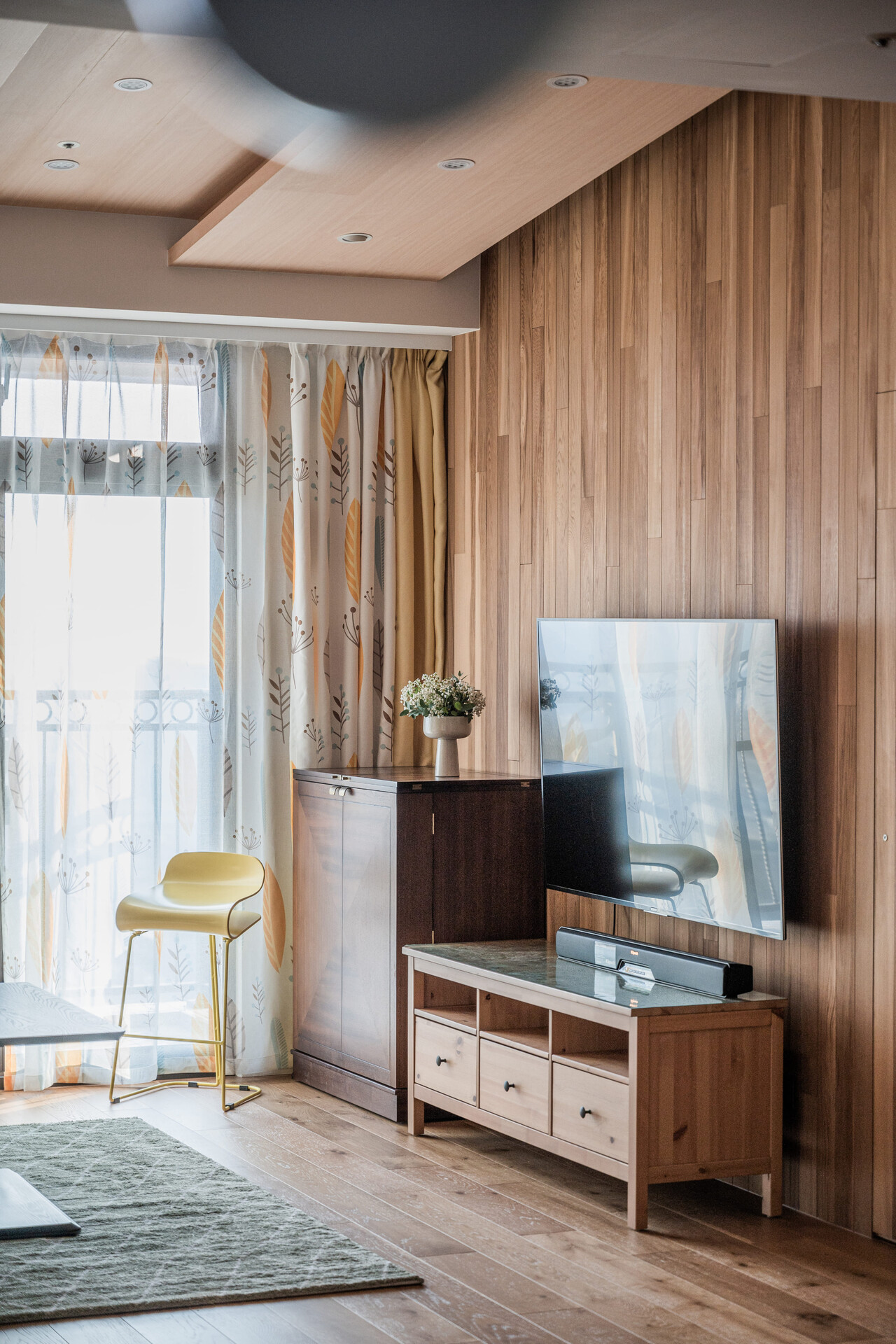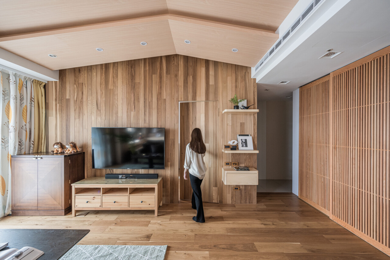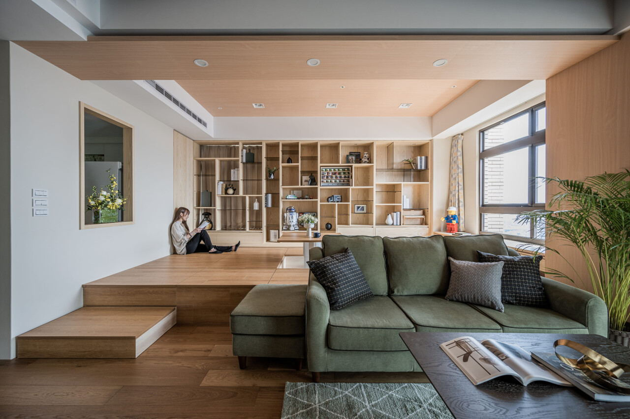 熱愛藝術、鍾情樂高,且熱衷蒐藏古物老件,是總監對於姊妹倆的深刻印象,而原木含蘊的自然放鬆氣息,也是兩人從一始終的偏愛,因此承襲第一次的美式鄉村風基調,挹注雲杉、栓木等實木素材,烘塑自在溫煦氛圍,亦借助淨高優勢,以斜向層板疊加交錯層次、強化小木屋的溫暖形象。同步重新檢視現有的生活模式,於客廳以架高設計框塑一方平台,搭配一張升降式茶桌,無論親友來訪或平日裡泡茶、看書或組樂高,都能擁有敞闊境地,並沿著立面砌築陳列牆,依據模型尺寸裁定格櫃,使每件心愛蒐藏各得其所。