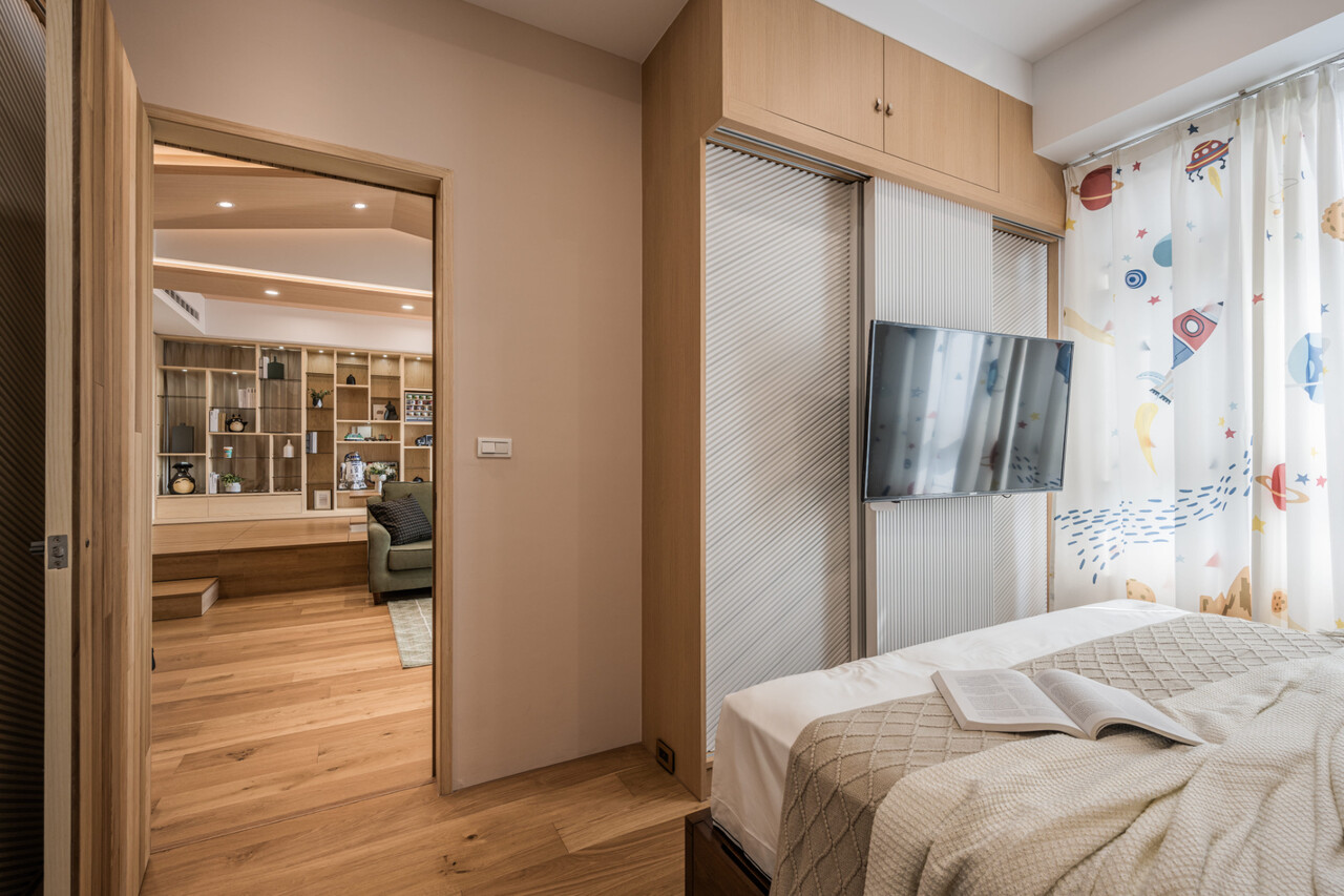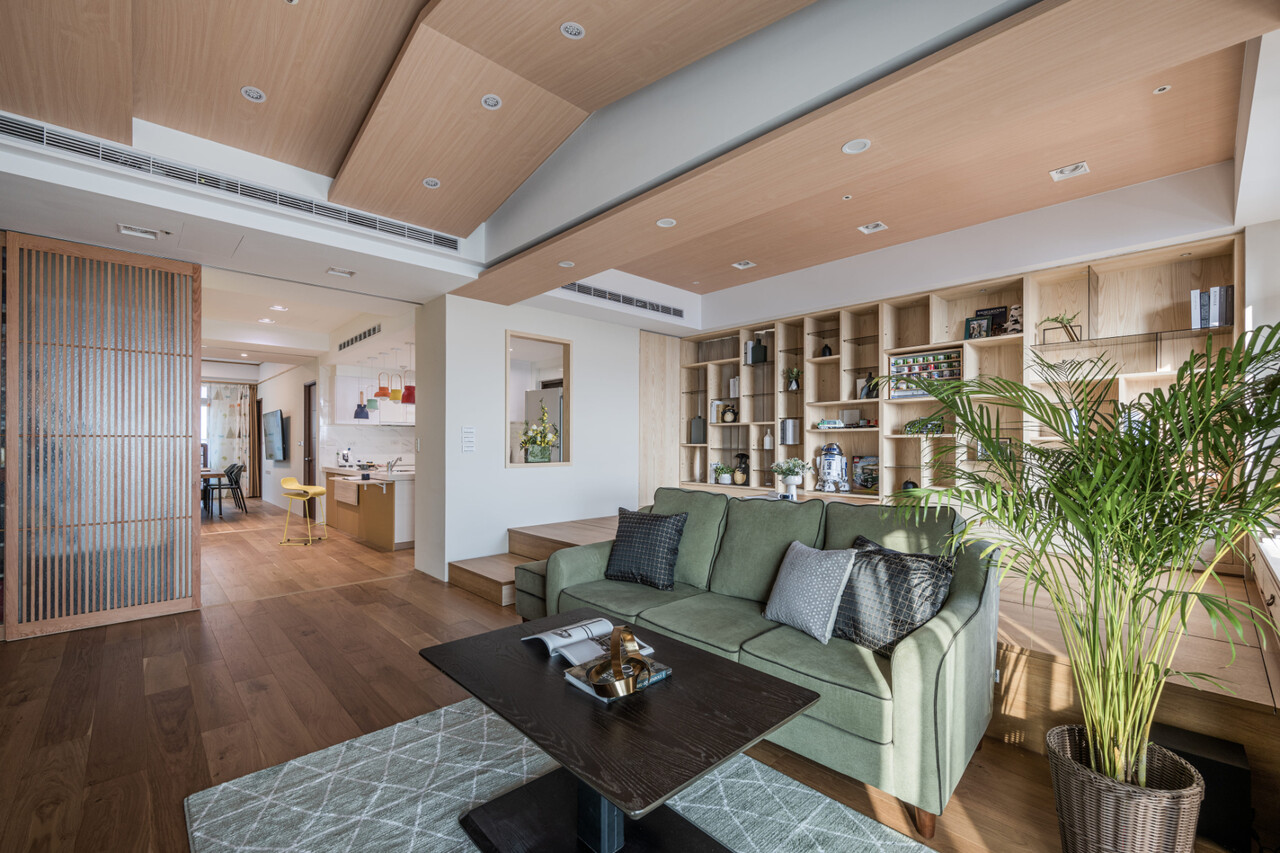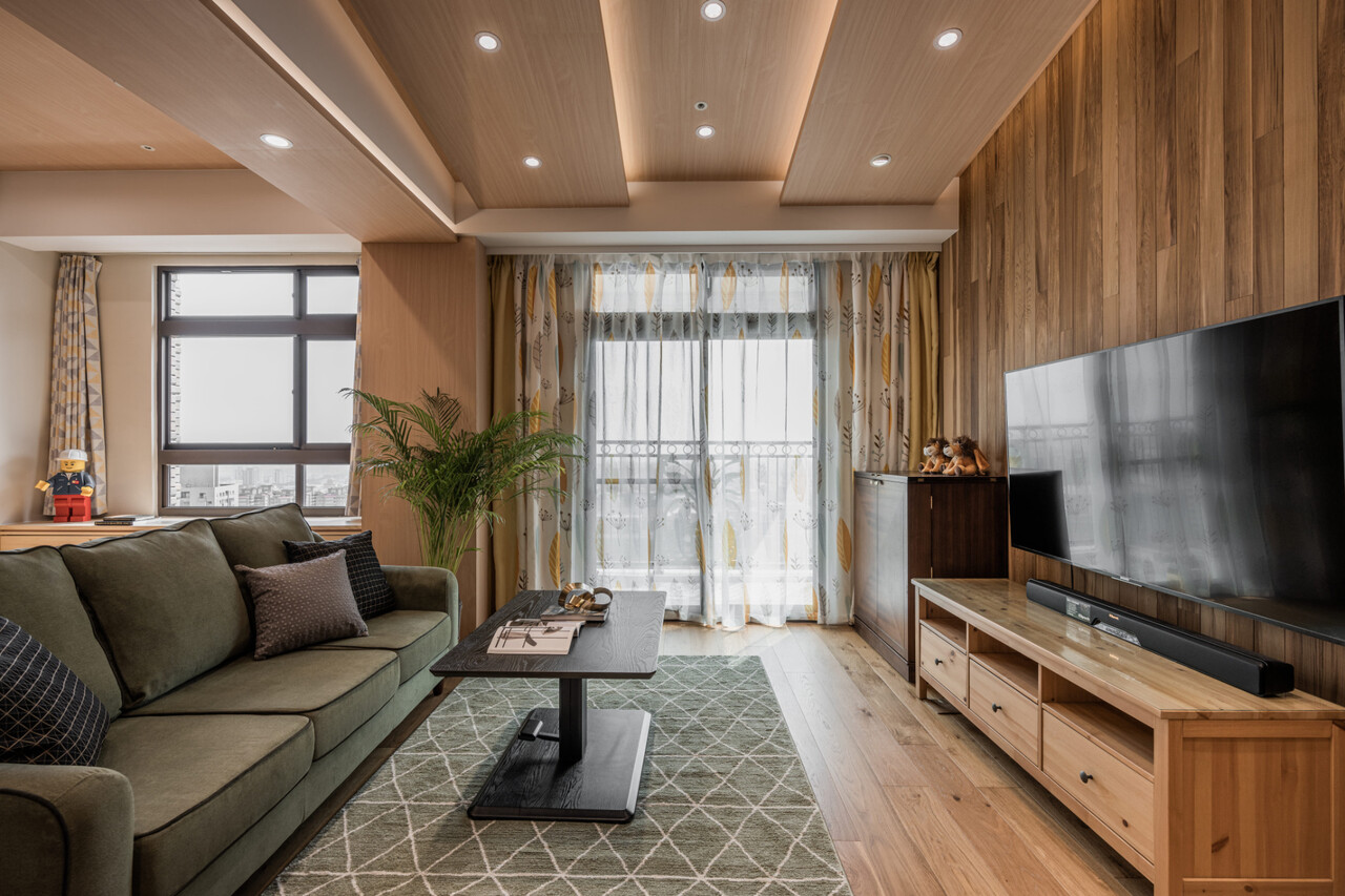 熱愛藝術、鍾情樂高,且熱衷蒐藏古物老件,是總監對於姊妹倆的深刻印象,而原木含蘊的自然放鬆氣息,也是兩人從一始終的偏愛,因此承襲第一次的美式鄉村風基調,挹注雲杉、栓木等實木素材,烘塑自在溫煦氛圍,亦借助淨高優勢,以斜向層板疊加交錯層次、強化小木屋的溫暖形象。同步重新檢視現有的生活模式,於客廳以架高設計框塑一方平台,搭配一張升降式茶桌,無論親友來訪或平日裡泡茶、看書或組樂高,都能擁有敞闊境地,並沿著立面砌築陳列牆,依據模型尺寸裁定格櫃,使每件心愛蒐藏各得其所。