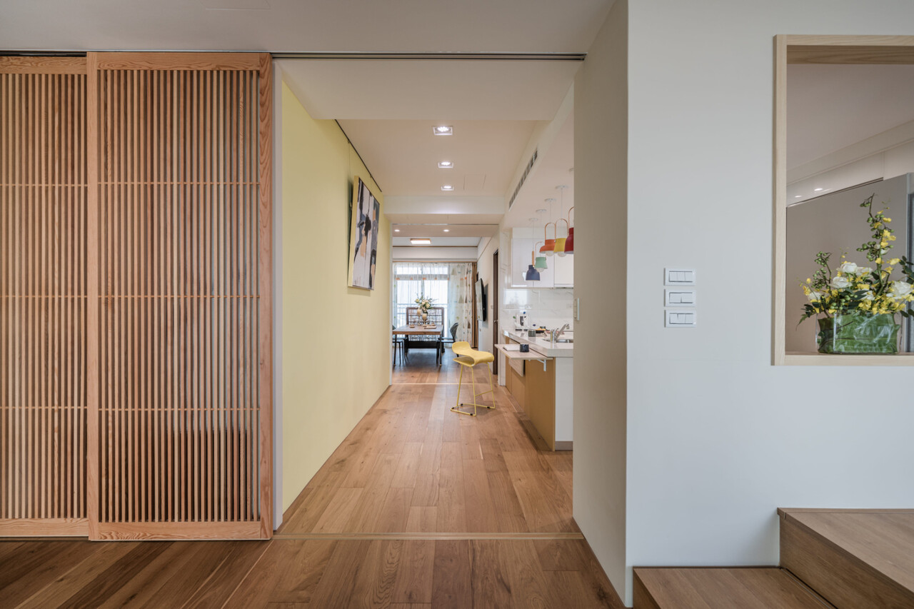 涵蓋地台亦是縝密配置,將高度提升至40公分,讓大型物件均能分格歸放,並且細心訂製一段收納式踏階,刻意將踏面幅寬擴增至60公分,即使未來年紀增長、須仰賴輔具之時,也能擁有穩妥舒適的動線。此外,鑑於基地屬於雙拼格局,將廚房當作貫串樞紐,於客廳一側設置格柵滑門,既能修飾儲物間與客廁門片,也可成為公領域的彈性分線,維護私隱、杜絕油煙,亦能提升冷房效應,穿梭向前,將建商附設的二座一字形廚具拆解重組,共構成一座機能齊備的ㄇ字型廚具。