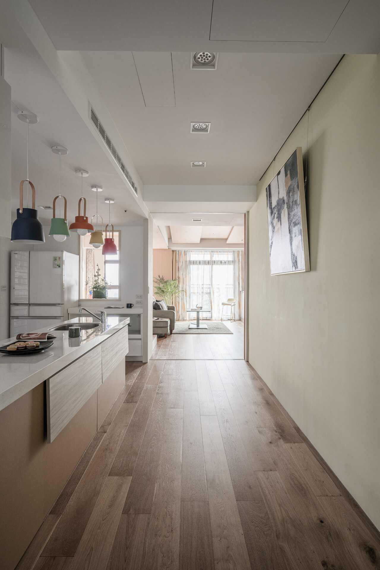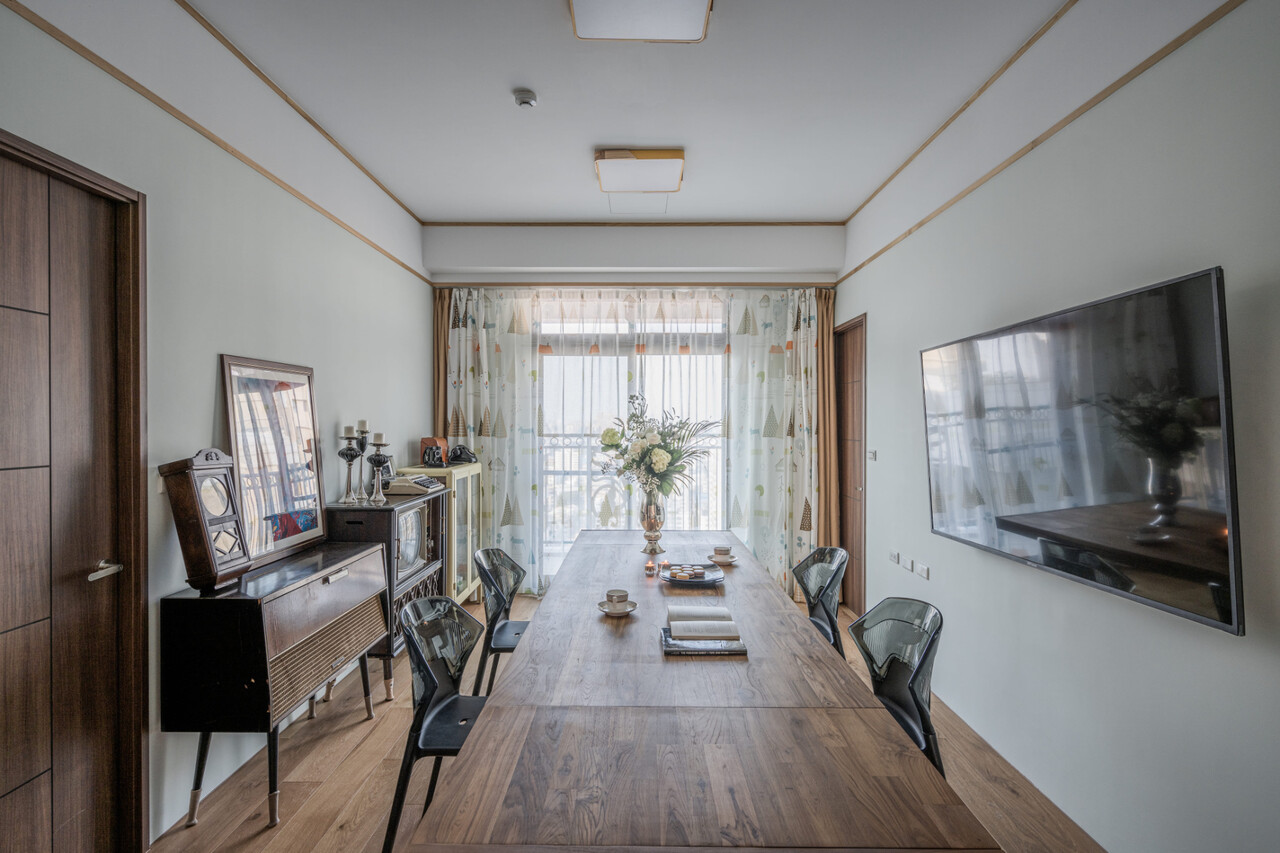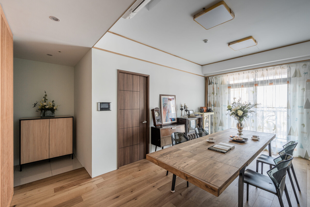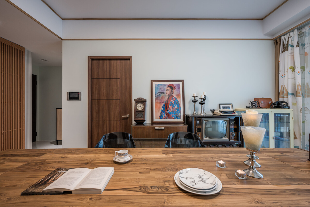 同步增設上掀式桌板,使感情融洽的姊妹倆,一個在料理烹飪時,一個可以幫忙試菜調味,不自覺間拉近心的距離;依序於餐廳擺上一張古風長桌,不只能擺上一桌美味佳餚,也能游刃有餘地拼4000塊拼圖或進行全開加大的創作,同步將珍藏的老件家具陳列在側,時刻被所愛之物包圍其中。