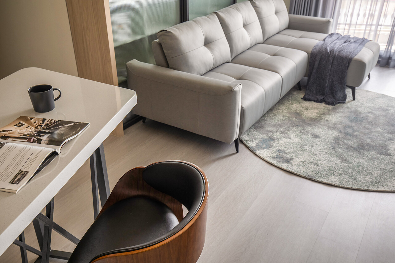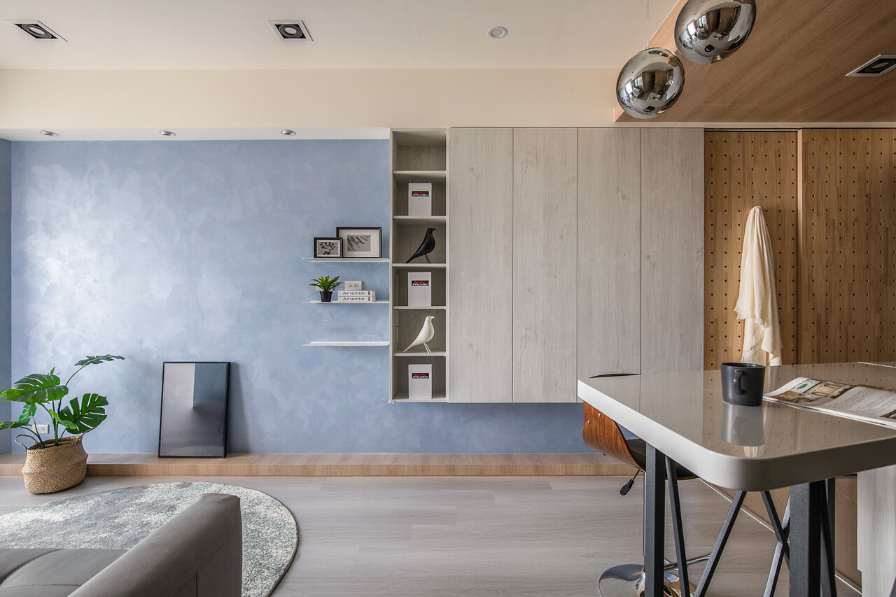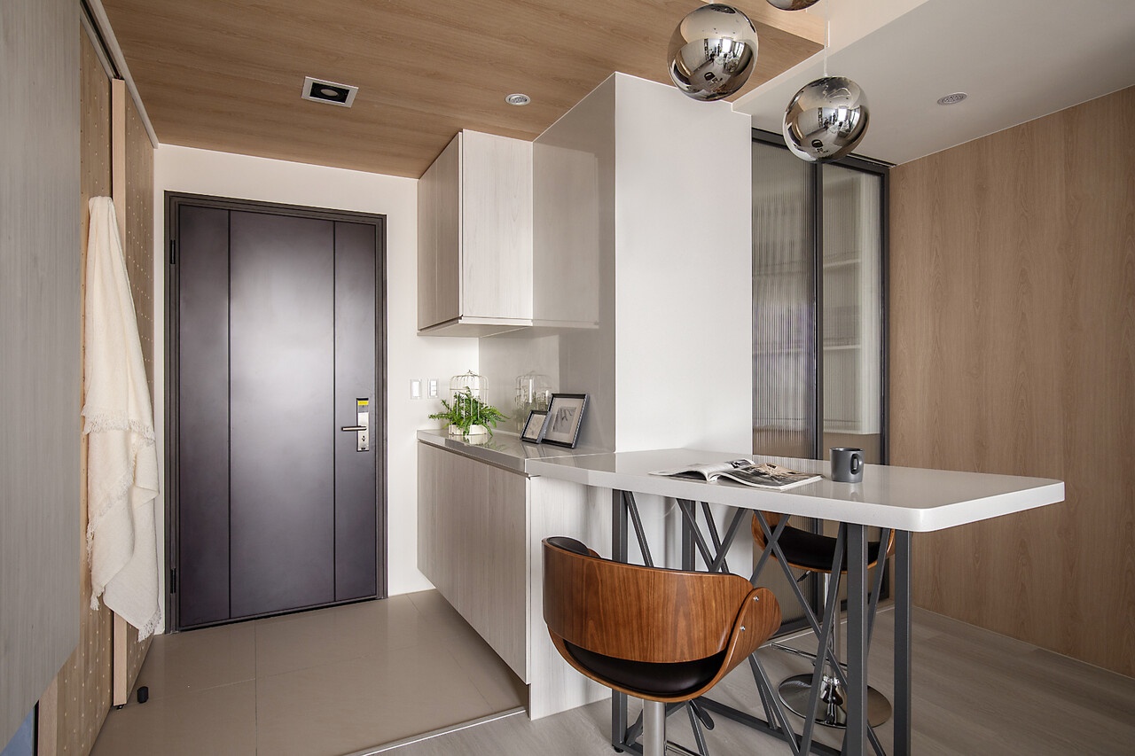 面對每日下班父母希望能夠有個小酌的空間及有了餐桌就無法有吧台的糾結取捨,在多方考量下,延伸的玄關櫃的檯面作為吧台跟餐桌的使用不僅滿足了空間的使用需求,也延伸了空間的視覺延伸度。