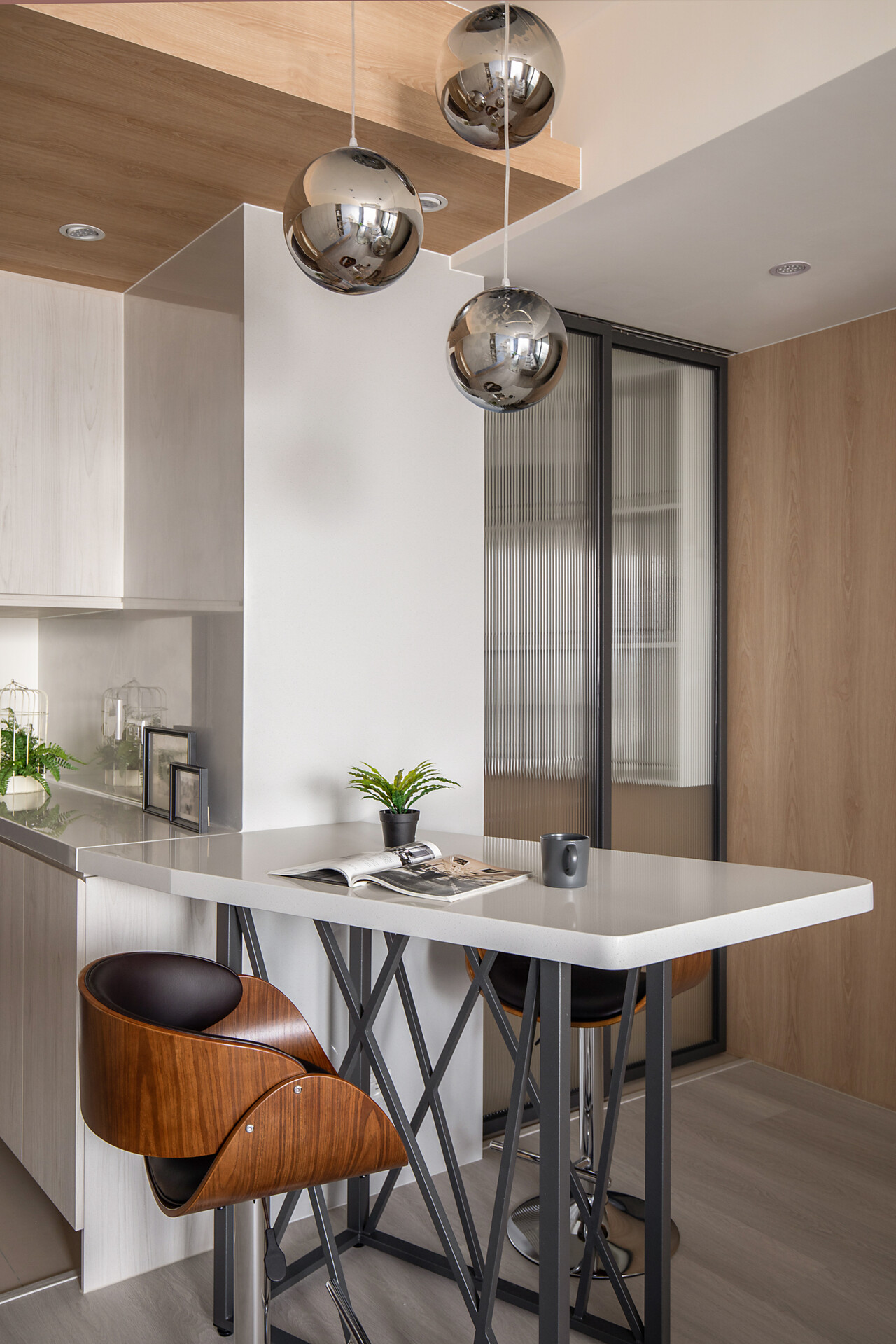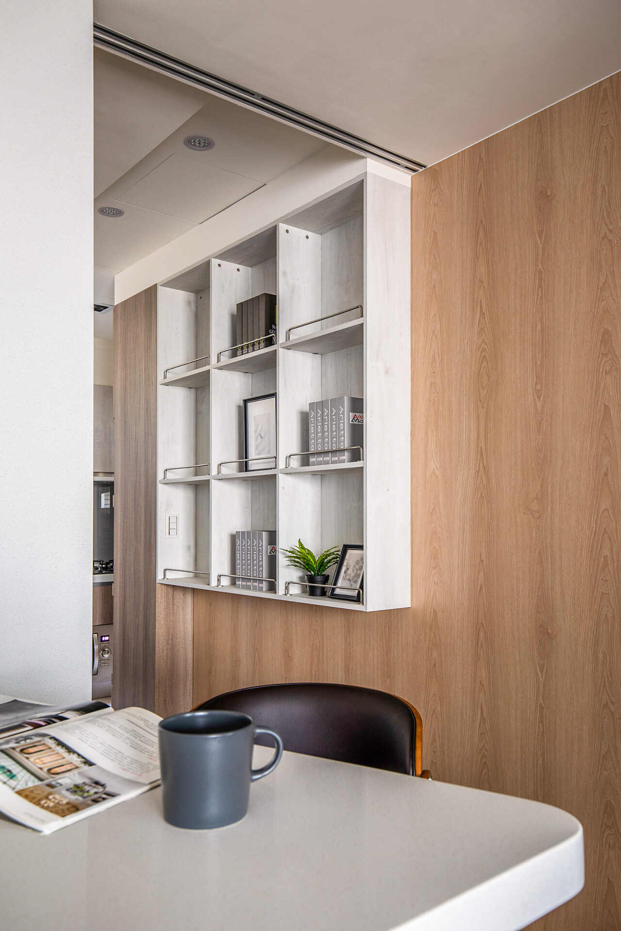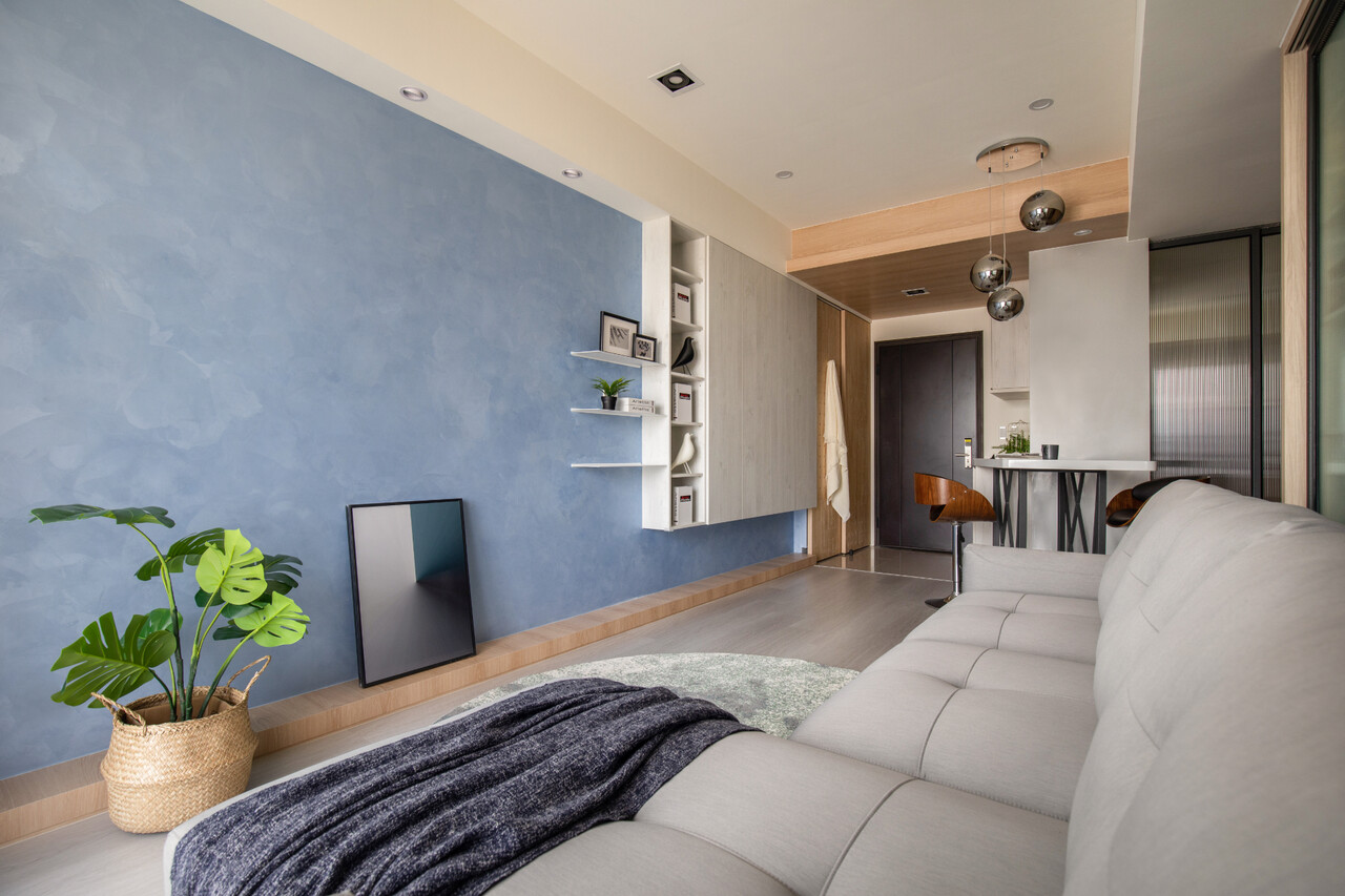 面對每日下班父母希望能夠有個小酌的空間及有了餐桌就無法有吧台的糾結取捨,在多方考量下,延伸的玄關櫃的檯面作為吧台跟餐桌的使用不僅滿足了空間的使用需求,也延伸了空間的視覺延伸度。