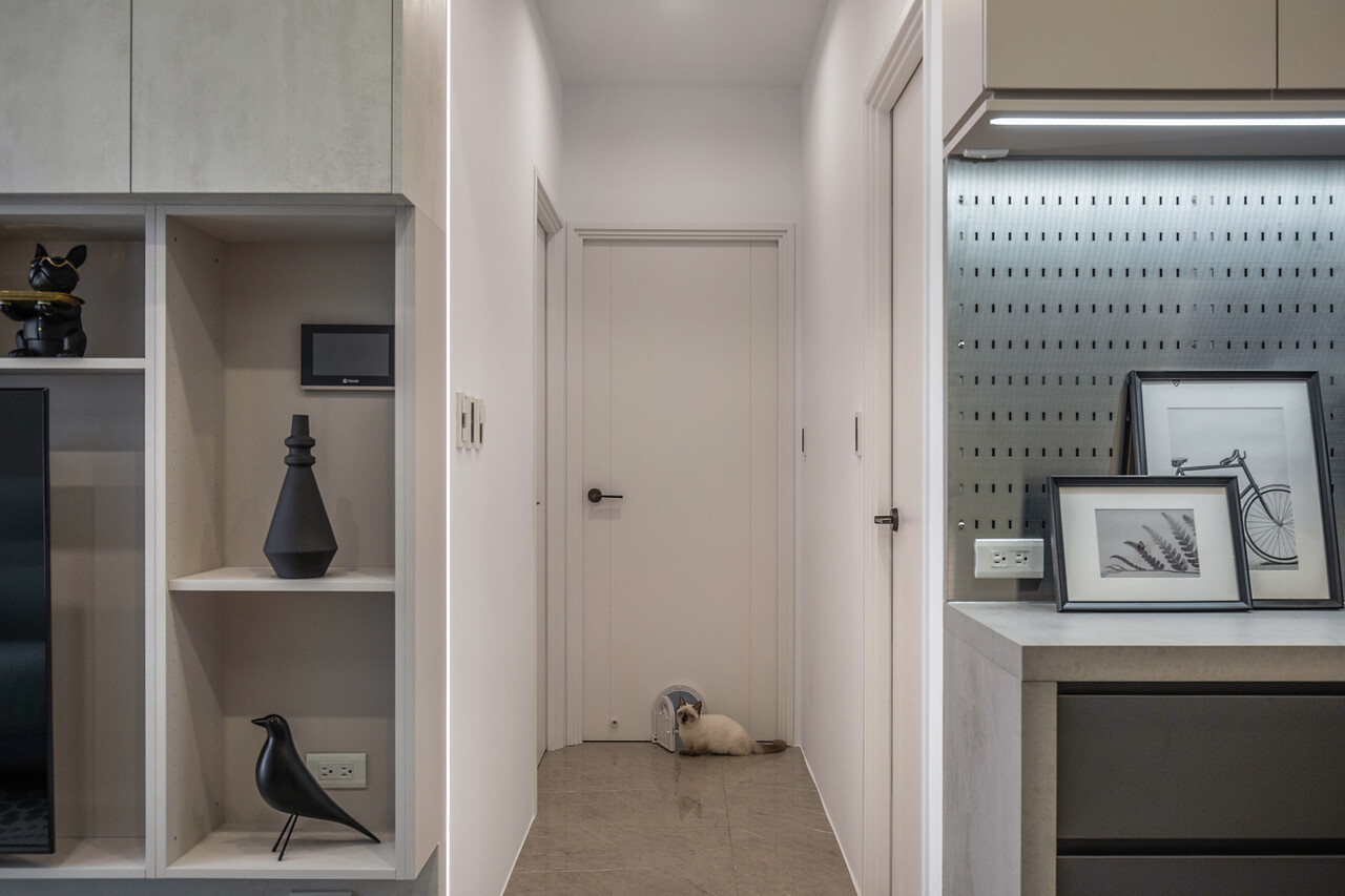 主要建材:清水模特殊漆、發泡線板、系統櫃、玻璃、鐵件